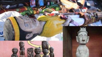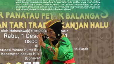 kepala berupa “lawung” atau ikat kepala yang diberi bulu burung Tingang atau Rangkong, dan sepasang tongkat bambu untuk properti tari.