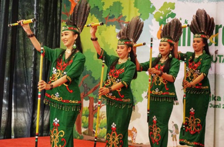 Adapun kostumnya atau busana penari perempuan terdiri baju adat suku Dayak berupa atasan lengan pendek yang bentuknya seperti rompi dengan kancing di bagian tengah, dan bawahan semacam rok sebatas lutut. Warna busana didominasi hitam dipadu dengan merah di bagian-bagian tertentu. Hiasan