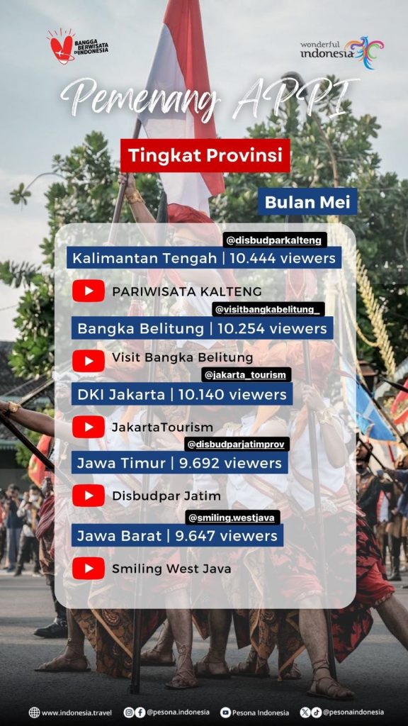 Disbudpar Kalteng mengungguli provinsi lain seperti Bangka Belitung, DKI Jakarta, Jawa Timur, dan Jawa Barat, yang masuk dalam 5 (lima) besar terbaik se-Indonesia. Prestasi membanggakan ini diumumkan langsung melalui akun Instagram @pesona.indonesia pada hari Sabtu tanggal 1 Juni 2024, pukul 22.10 WIB. APPI bulan Mei mengangkat tema “CoE/Event Daerah”, yang menyoroti berbagai acara budaya yang diselenggarakan di masing-masing provinsi.