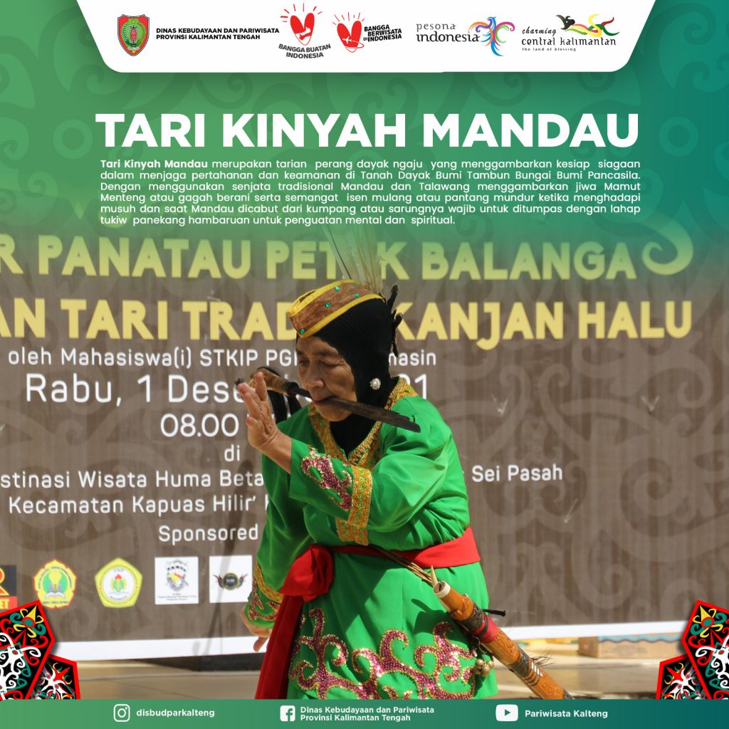 Tari Kinyah Mandau merupakan tarian perang dayak ngaju yang menggambarkan kesiap siagaan dalam menjaga pertahanan dan keamanan di Tanah Dayak Bumi Tambun Bungai Bumi Pancasila. Dengan menggunakan senjata tradisional Mandau dan Talawang menggambarkan jiwa Mamut Menteng atau gagah berani serta semangat isen mulang atau pantang mundur ketika menghadapi musuh dan saat Mandau dicabut dari kumpang atau sarungnya wajib untuk ditumpas dengan lahap tukiw panekang hambaruan untuk penguatan mental dan spiritual.Tari ini juga menggunakan garantung atau gong sebagai pijakan yang melambangkan harkat martabat yang tinggi serta Kesejahteraan dan kemakmuran.